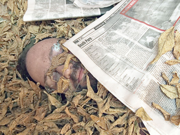Двое в касках – сотрудники «Ультра.Культуры» – с явным усилием дотащили Белковского на руках к центру композиции из разных причудливых объектов и буквально бросили на заготовленную лежанку – вроде тех, что обустраивают для ночлега бомжи. После чего политтехнолога полностью засыпали листвой и какой-то ветошью. Виноградов изрядно плеснул в образовавшуюся кучу из ведра (кажется, все-таки водой), покружил вокруг с паяльной лампой, но жечь не стал.